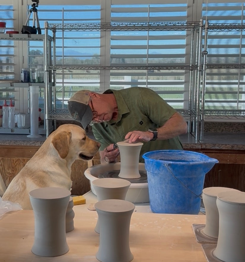 Mud and Labrador retrievers have been part of my life for as long as I can remember. As a kid, I spent most of my time in the backyard making mud pies and questionable “art,” usually with a pair of muddy Labs by my side. After a 45-year break following my one and only high-school ceramics class, the strange quiet of COVID pulled me back into the mud — this time in the form of clay.I’m mostly self-taught, with a few private lessons and a whole lot of time at the University of YouTube. Skilled potters will spot things I could do better… and they’d be right. I make plenty of mistakes. Bowls become plates. Plates become spoon rests. Cups become pen holders or paper weights. For years I was too embarrassed to sell anything, so the shelves filled up fast. With some strong encouragement from my wife, Ginger, I finally decided to share my “learning curve” pieces with the world.Every piece is handmade, one of a kind, and created under the watchful eyes of my two loyal Labradors, Cooper and Maverick.They don’t help much — but they do keep morale high and the floor very furry